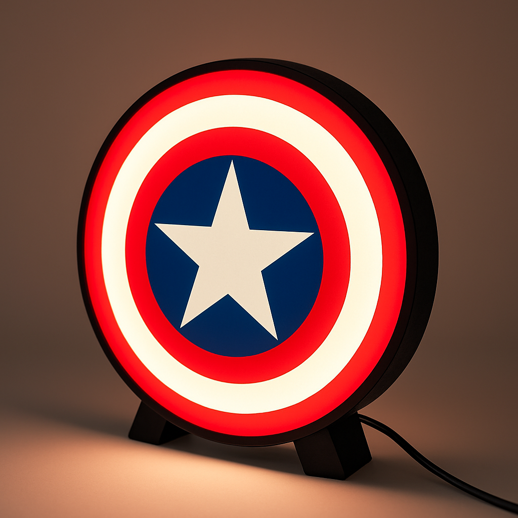 Lámpara plana retroiluminada inspirada en el escudo del Capitán América. Iluminación LED decorativa con un diseño potente y reconocible.